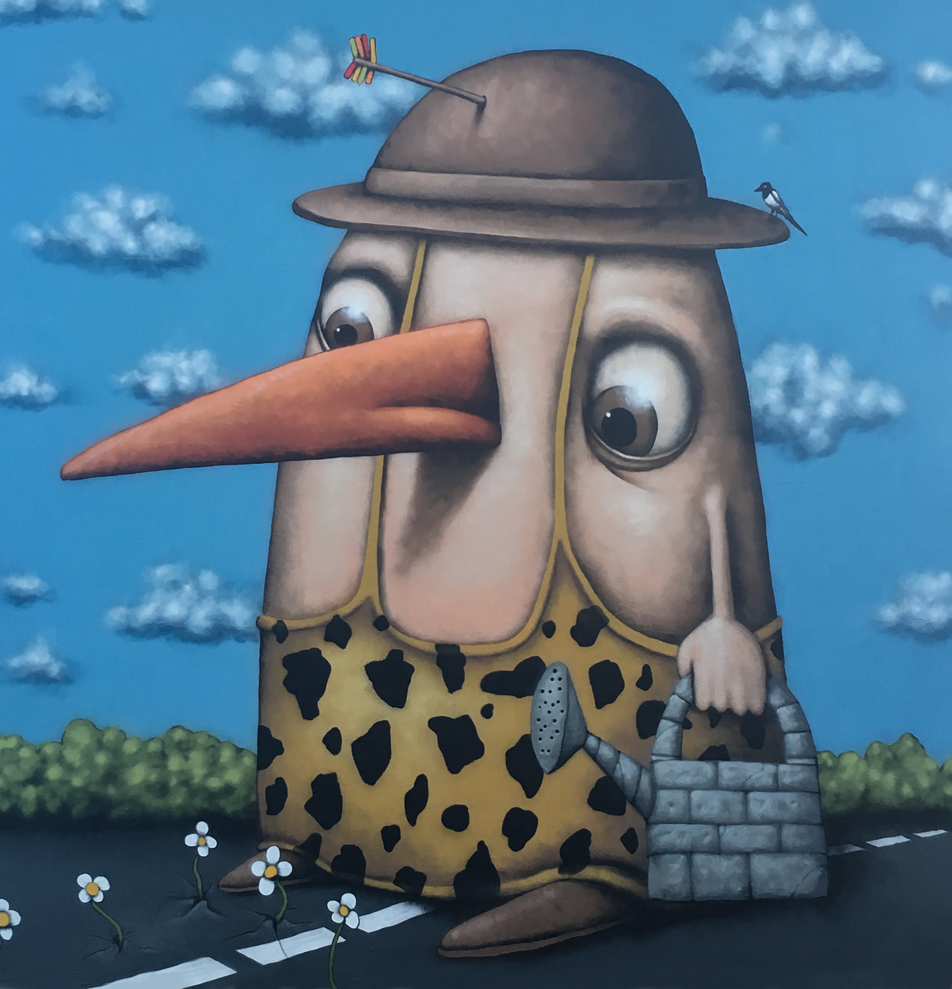Ses œuvres représentent son propre univers, rempli de personnages humanoïdes imaginaires, généralement à la bouche grande et au nez long. Le but de son travail est de raconter des histoires et de poser des questions. Les autres graffeurs, les bandes dessinées, l’actualité et son environnement sont sa source d’inspiration.